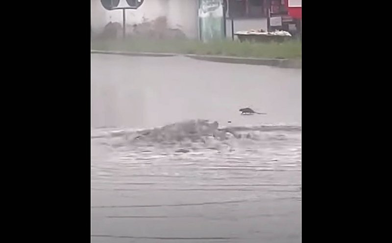 Pe strada Unirii, apa care a refulat din canale a adus cu ea şi mai mulţi şobolani, care încercau să se salveze şi să se ferească de roţile maşinilor, transmite dejeanul.ro.