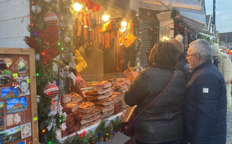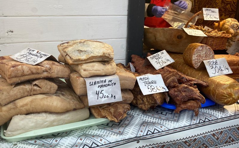 "Suntem de la 10 la 22 deschiși, zilnic. Avem produse proaspete de porc, doriți să gustați? Am fost și în anii trecuți, aveam căsuța pe cealaltă parte", a declarat doamna de la căsuța cu slănini și cârnați, unde stăteau la coadă circa 6 persoane, într-o după masă de luni.