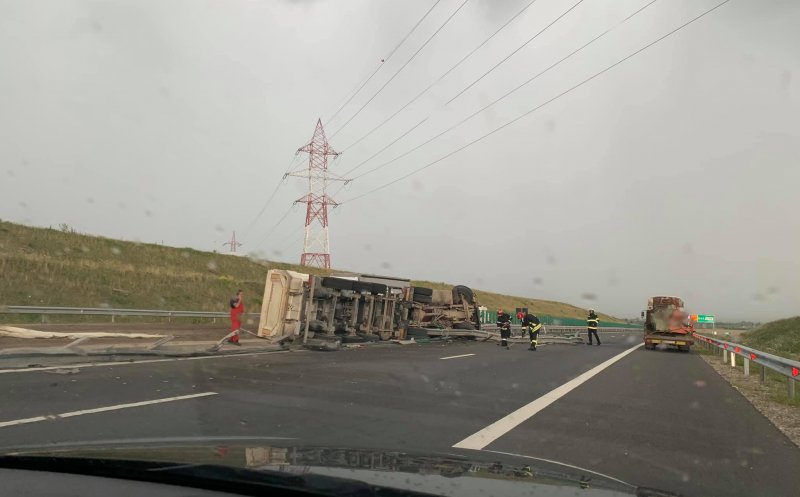 Foto Un camion plin cu nisip s-a răsturnat pe A10
