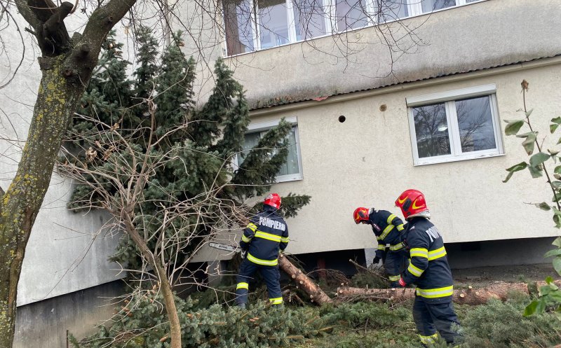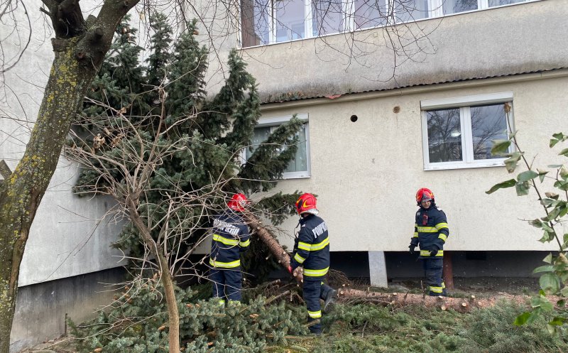 Un brad s-a rupt și a căzut, în cursul zilei de luni, din cauza vântului, peste fațada unui bloc de pe strada Anina. Pompierii au intervenit și au tăiat bradul pentru a-l lua de acolo.
