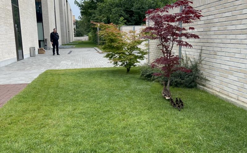 O operațiune neobișnuită a avut loc, miercuri dimineață, în centrul orașului, unde o familie de rațe, formată dintr-o femelă și cei nouă pui ai săi, au fost ghidați și mutați cu succes din curtea unei instituții bancare către Iulius Park.