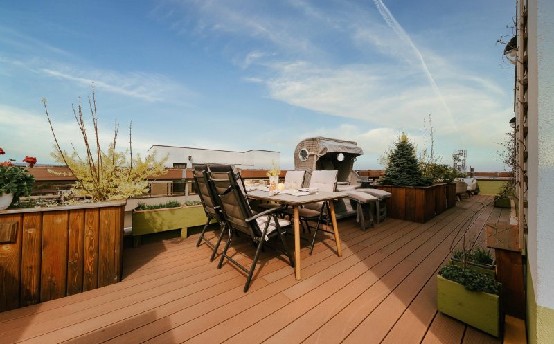 Penthouse-ul propus are o terasă panoramică de circa 100 metri ce permite amenajarea unei grădini suspendate. Se află pe strada Eugen Ionesco.