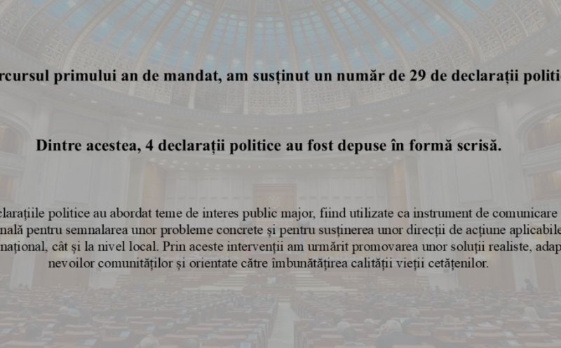 „Pe parcursul primului an de mandat, am susținut un număr de 29 de declarații politice, dintre acestea, 4 declarații politice au fost depuse în formă scrisă. Declarațiile politice au abordat teme de interes public major, fiind utilizate ca instrument de comunicare instituțională pentru semnalarea unor probleme concrete și pentru susținerea unor direcții de acțiune aplicabile atât la nivel național, cât și la nivel local. Prin aceste intervenții am urmărit promovarea unor soluții realiste, adaptate nevoilor comunităților și orientate către îmbunătățirea calității vieții cetățenilor.