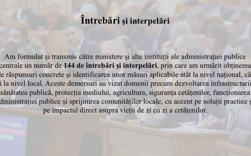 Deputatul PSD Cluj a formulat și transmis către ministere și alte instituții ale administrației publice centrale un număr de 144 de întrebări și interpelări, prin care am urmărit obținerea de răspunsuri concrete și identificarea unor măsuri aplicabile atât la nivel național, cât și la nivel local.