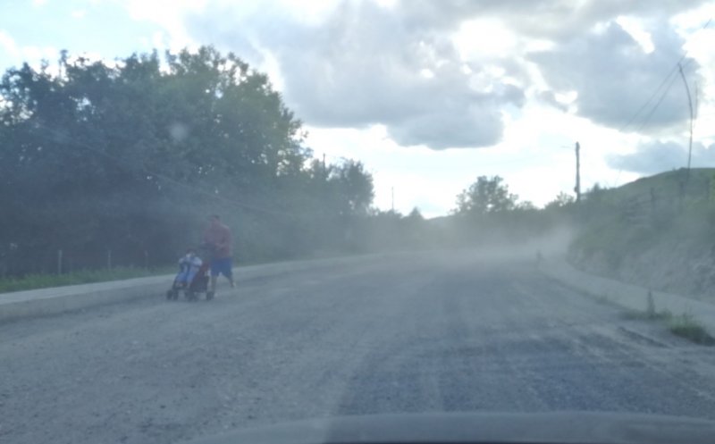 - aerul irespirabil din cauza prafului ridicat de mașini și faptul că nu există nici măcar o cisternă cu apă care să umezească drumul pentru a împiedica ridicarea prafului (poză atașată cu mamă cu copil în cărucior acoperit de nor de praf, în Așchileu Mare)