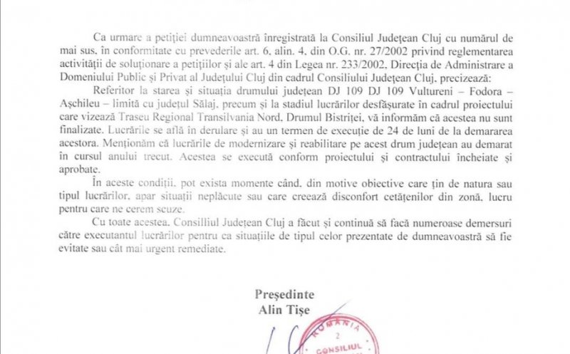 În urmă cu mai bine de o lună, PRO România Așchileu a solicitat Consiliului Județean Cluj luarea tuturor măsurilor necesare pentru diminuarea poluării cu praf datorată lucrărilor de modernizare a DJ109, precum și presemnalizarea corespunzătoare a acestor lucrări și a materialelor depozitate pe drum, care pun în pericol siguranța cetățenilor care circulă pe tronsonul menționat. Deși, în adresa de răspuns, Consiliul Județean Cluj își cerea scuze pentru situația creată, încă nu a fost implementată nicio măsură pentru reducerea disconfortului cetățenilor.