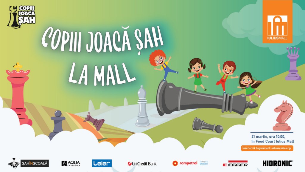 Sâmbătă, 21 martie 2026, începând cu ora 10:00, food court-ul devine locul de întâlnire pentru micii pasionați de strategie, în cadrul unei noi ediții „Copii joacă șah la mall”. Competiția este dedicată tuturor copiilor, astfel că pot participa mici jucători care încă sunt la grădiniță, până la elevi din ciclul gimnazial. Aceștia vor concura în funcție de vârstă și de nivelul de experiență.