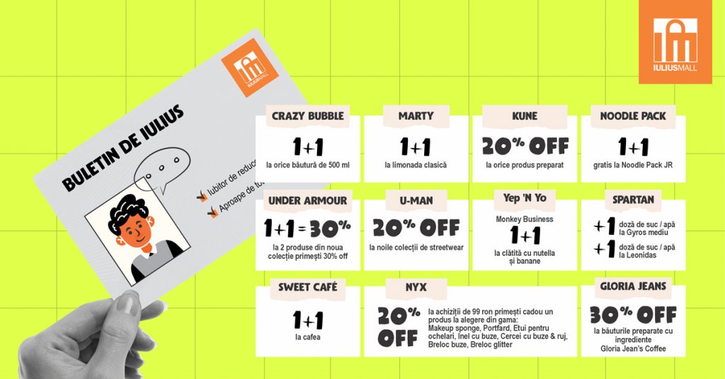 Toate ofertele sunt disponibile exclusiv cu „buletinul” de Iulius, iar după ce bifezi cele 11 promoții și vii la Centru Info, primești și un voucher de parcare. Regulamentul campaniei îl găsești și pe site-ul Iulius Mall Cluj.