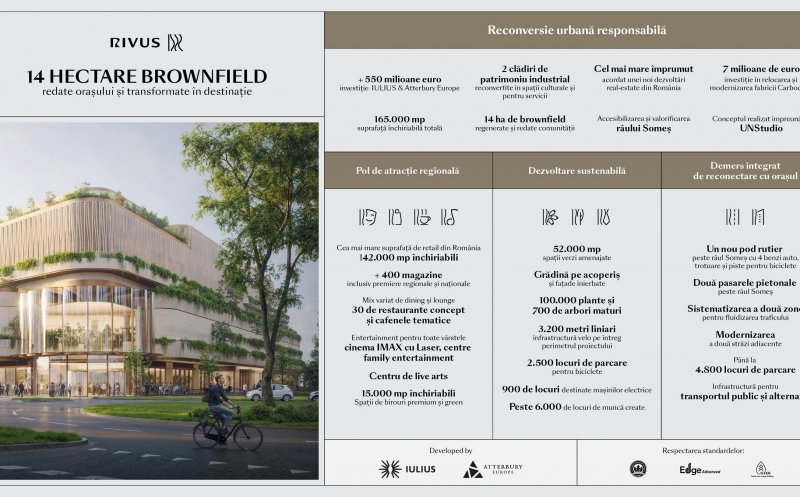 Proiectul RIVUS Cluj-Napoca, dezvoltat de IULIUS și Atterbury Europe, intră în etapa de execuție. Cu o investiție estimată la peste jumătate de miliard de euro, este cea mai amplă dezvoltare real-estate prin reconversie urbană în desfășurare din România. Demersul transformă fosta platformă industrială Carbochim, în prezent relocată și retehnologizată, într-o destinație reper, cu un mix de funcțiuni personalizat pentru dinamica orașului Cluj-Napoca: culturale, educaționale, de entertainment, office, retail, parc și spații pentru petrecerea timpului în aer liber. Conceptul, realizat împreună cu celebrul birou internațional de arhitectură UNStudio, pune accent pe sustenabilitate, integrare fluidă, comunitate și identitate locală.