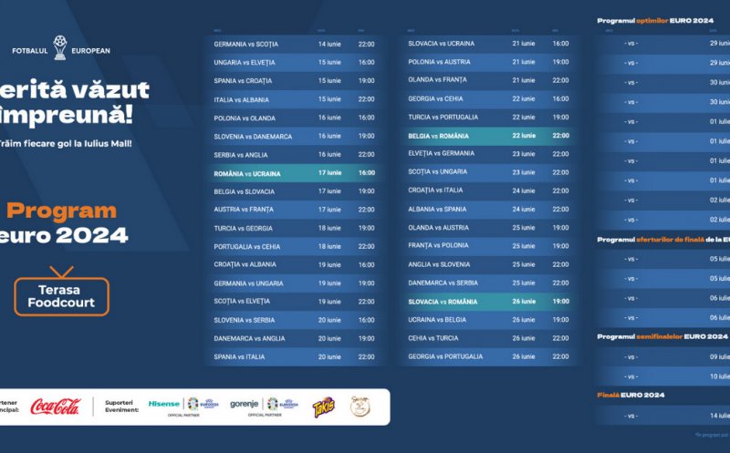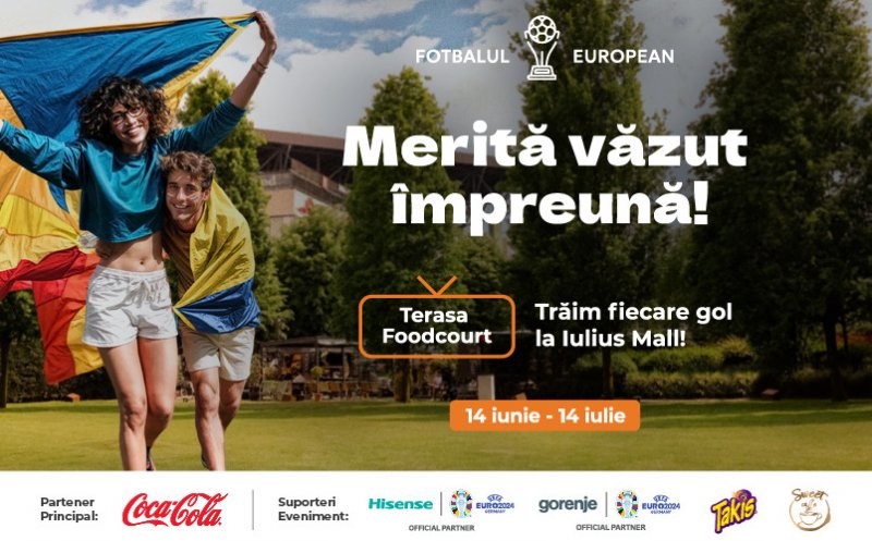 Iar pentru a te convinge că „merită văzut împreună”, accesează filmulețul postat de Iulius Mall! Fii pregătit pentru o atmosferă plină de emoții și vino să îți susții echipa preferată la Euro 2024! Partenerul principal al evenimentului este: Coca Cola, iar sponsorii evenimentului sunt Takis, Hisense, Gorenje si Sweet Caffe.
