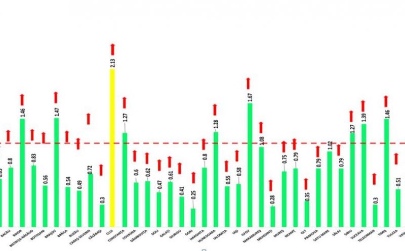 În ceea ce privește incidența infectărilor cumulate la 14 zile, raportate la 1.000 de locuitori, judeţul Cluj se situează pe primul loc, cu 2,13 cazuri la mia de locuitori. Incidenţe mari înregistrează şi în judeţele Ilfov - 1,67 şi Arad - 1,61.