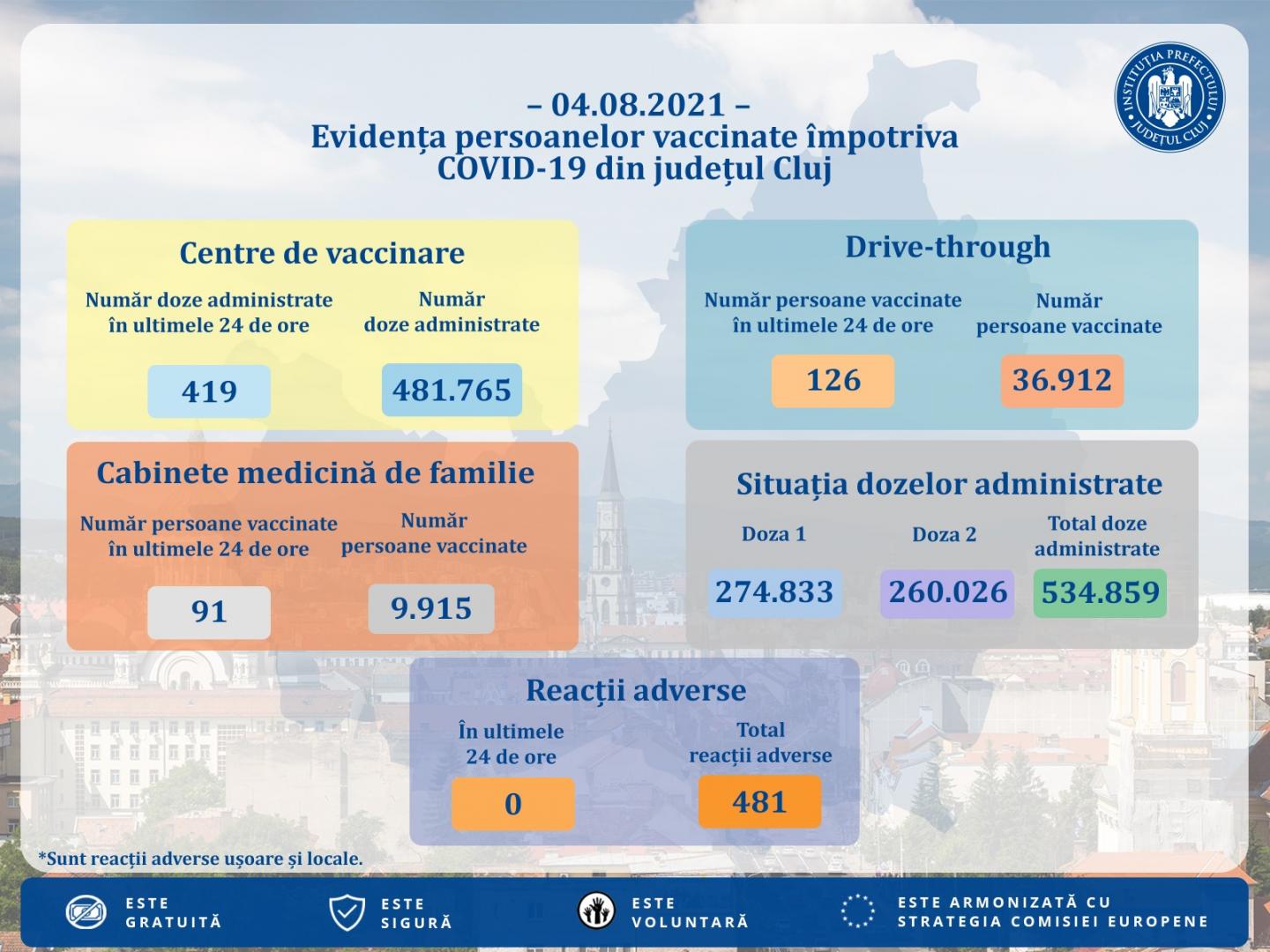 În urma administrării vaccinurilor nu a fost semnalată nicio reacție adversă, astfel că, de la începutul campaniei de vaccinare, la Cluj au fost raportate 481 de reacții adverse.