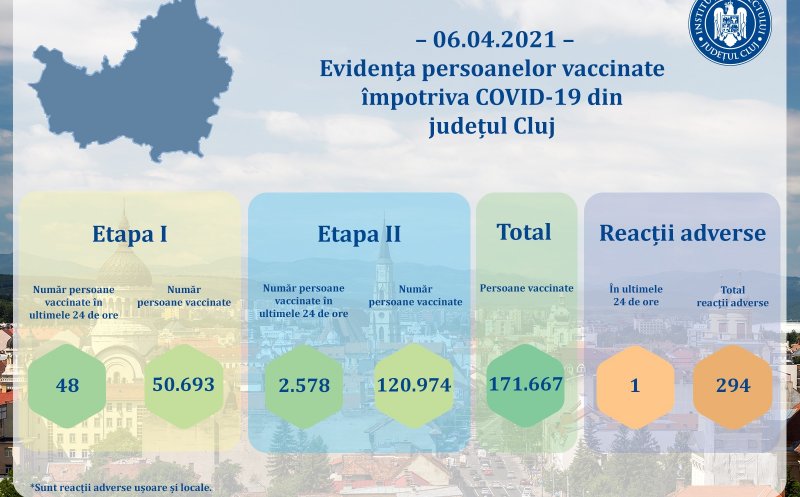 Totalul persoanelor vaccinate în județul Cluj a ajuns la 171.667, dintre care 50.693 eligibili în prima etapă și 120.974 eligibili în etapa a doua. În ultimele 24 de ore au fost vaccinate împotriva COVID la Cluj 2.626 de persoane, dintre care 48 cadre medicale și 2.578 pacienți care se încadrează în etapa a doua și a fost înregistrată o reacție adversă. De la începutul campaniei de vaccinare și până în prezent, la nivelul județului Cluj au fost înregistrate în total 294 de reacții adverse, în urma administrării serului.