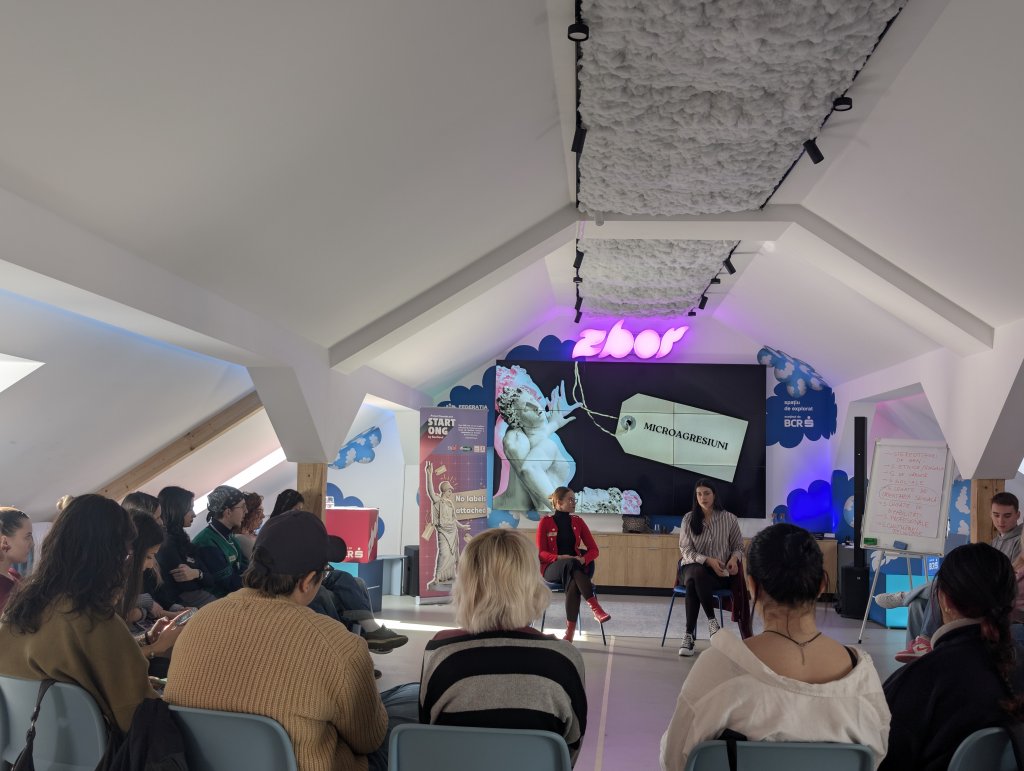 Atelierul despre stereotipuri de gen, comunicare asertivă (empatică), tipuri de violență, microagresiuni și violență simbolică a cerut curaj și finețe. S-a lucrat pe exemple reale din media. Împreună cu cei 2 psihologi ai Asociației EROS, Teodora Bîrlea și Medeea Pălăcean (Rus) tinerii au exersat întrebări care deschid, nu acuză. Cum violența simbolică e atât de fină și neobservabilă, dar lasă urme adânci asupra noastră ca societate și credințe. Acolo vezi, pe viu, cum un „bărbații care plâng pierd credibilitate” se demontează când îl așezi în context: cine a decis asta? pe ce dovezi? ce exemple contrazic? În locul unui duel de opinii rămâne un ghid de conversație care poate fi purtat în redacții, pe platouri sau în comentarii online. O altă observație importantă vine din partea unei studente: „Microagresiunile sunt valide și nu trebuie minimalizate.”