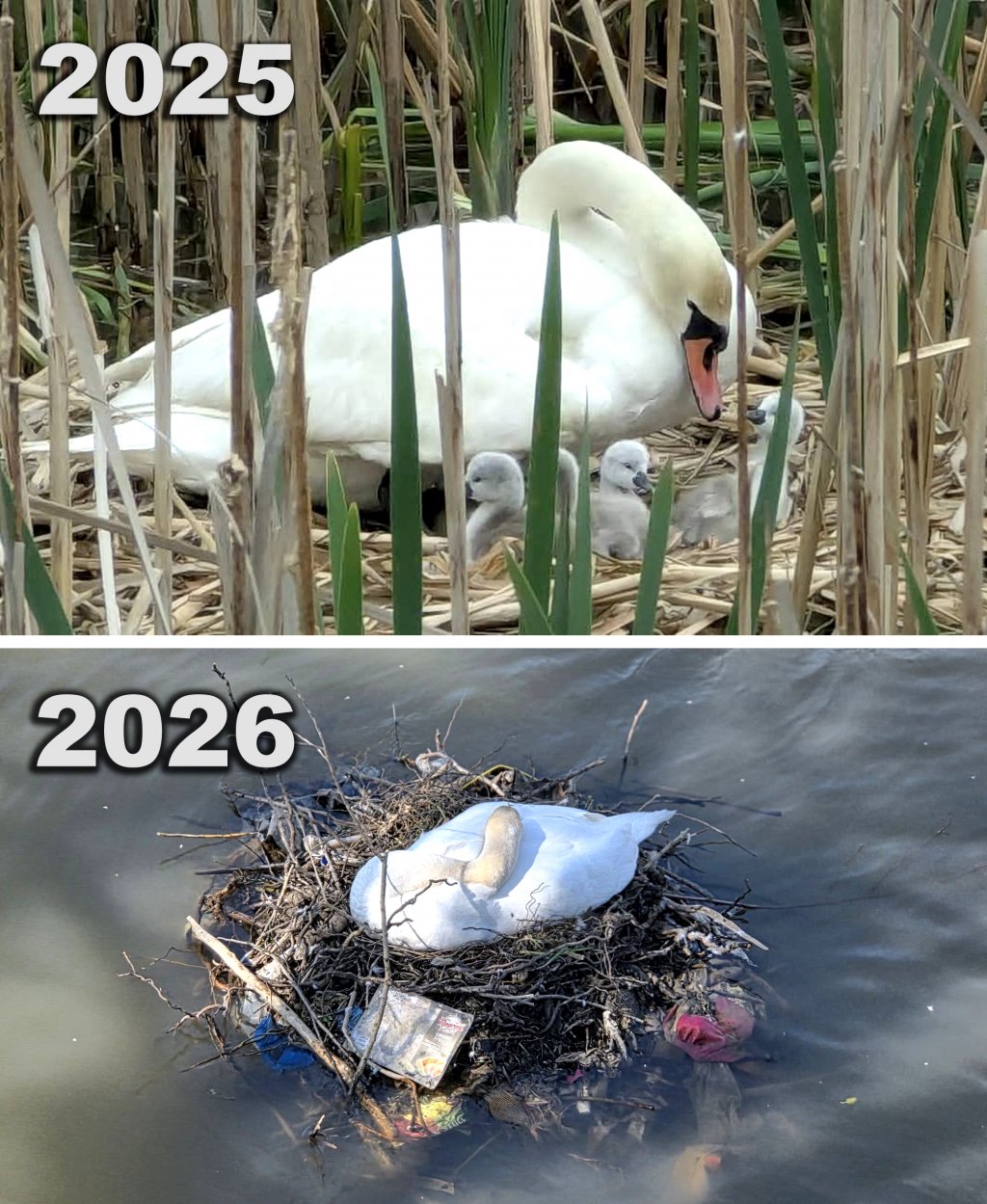 Clujenii continuă să posteze imagini cu lebedele de anul acesta prin comparație cu cele de anul trecut care au avut protecția vegetației, mai ales când bobocii au ieșit din găoace. Dacă va rezista cuibul de anul acesta, iar micuțele lebede vor veni pe lume, în cele din urmă, pericolul va fi iminent din cauza faptului că puii nu vor putea înota la nesfârșit în valurile râului, fără a avea un loc protejat în habitatul lor, altul decât cuibul tapetat cu pungi, cârpe sau alte gunoaie.