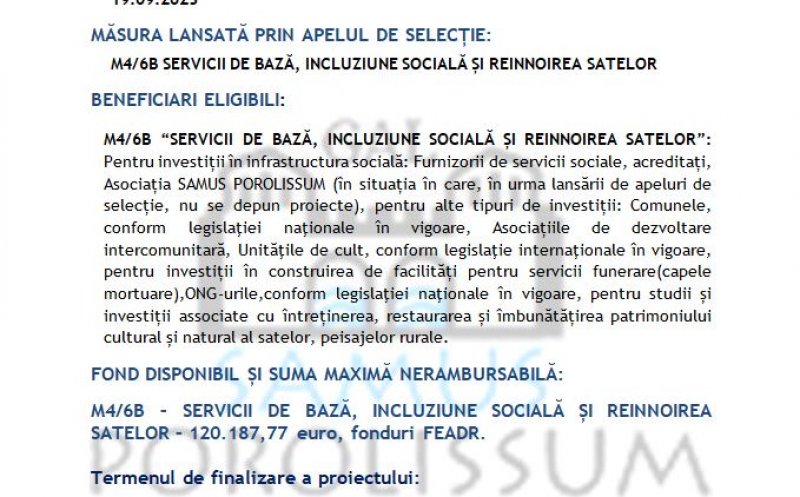 Asociația Samus Porolissum lansează, în data de 19 septembrie 2023, apel de selecție pentru măsura M4/6B "Servicii de bază, incluziune socială și reînnoirea satelor".