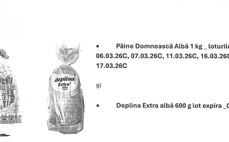 Autoritatea Națională Sanitară Veterinară și pentru Siguranța Alimentelor (ANSVSA) anunță că firma Vel Pitar România a decis, ca măsură de precauție, retragerea voluntară a unor loturi limitate de pâine Domnească Albă 1 kg și Deplina Extra Albă 600 g din Cluj.